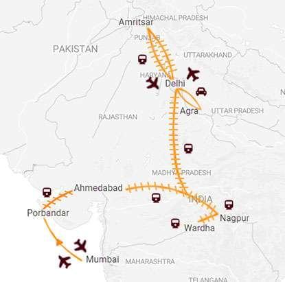 Mumbai – Porbandar – Ahmedabad – Wardha – Delhi – Amritsar – Delhi – Agra – Delhi
